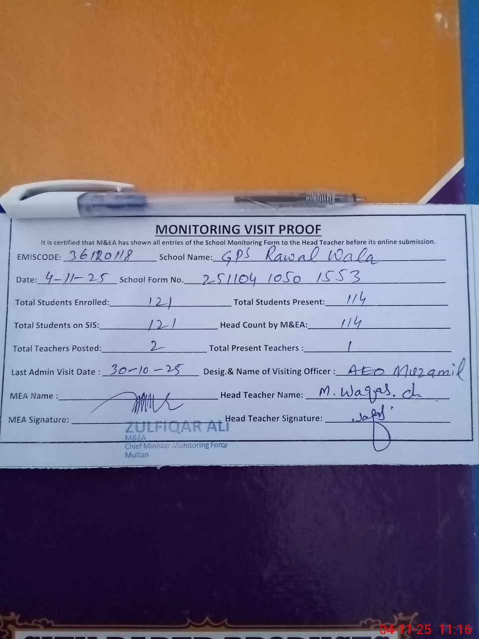 | Attendance Register | Head Teacher | MEA with School | Visit Proof |