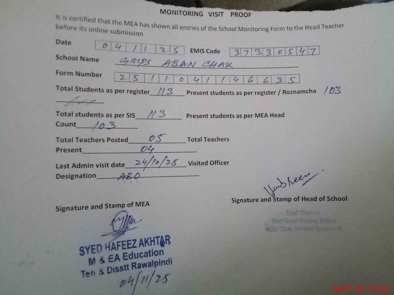 | Attendance Register | Head Teacher | MEA with School | Visit Proof |