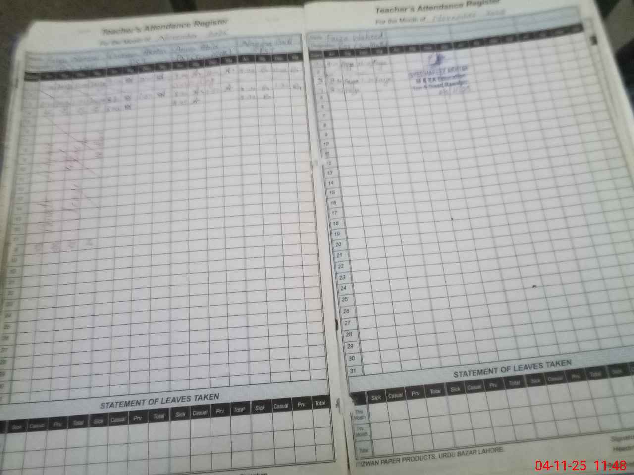 | CNIC | Full Name | Designation | R/C | Absence During Last Calender Month |