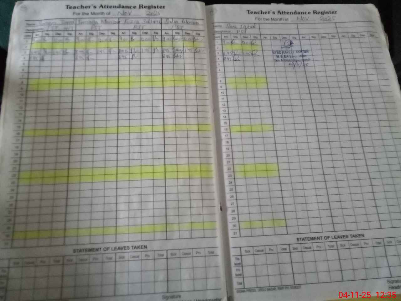 | CNIC | Full Name | Designation | R/C | Absence During Last Calender Month |