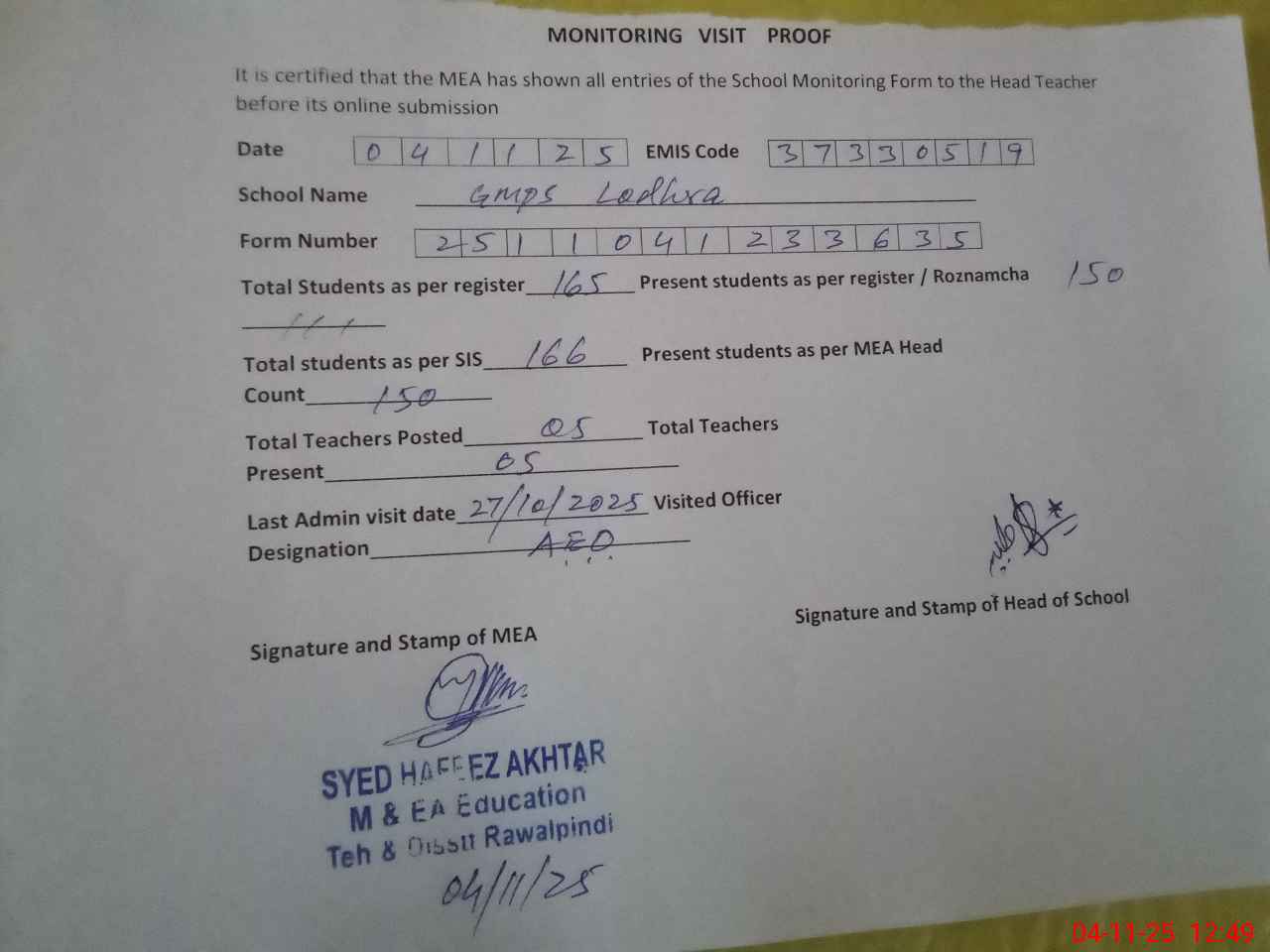 | Attendance Register | Head Teacher | MEA with School | Visit Proof |