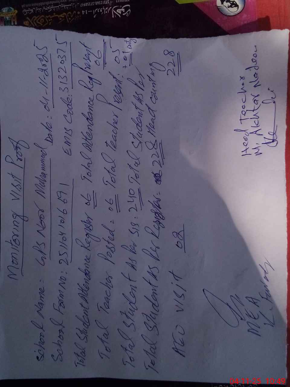 | Attendance Register | Head Teacher | MEA with School | Visit Proof |