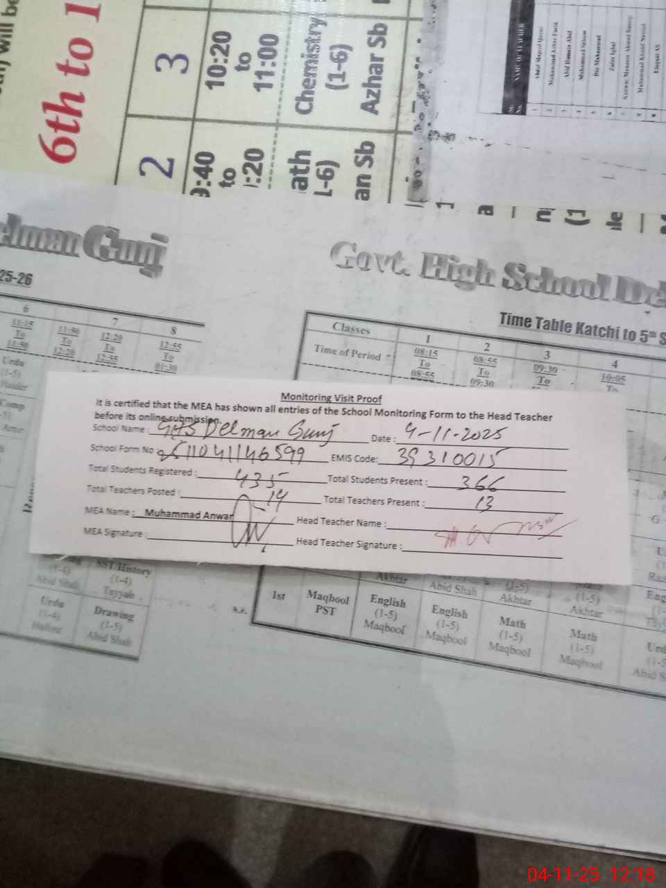 | EMIS Code: 39310015 | Name of School: GHS DELMAN GUNJ OKARA | |||