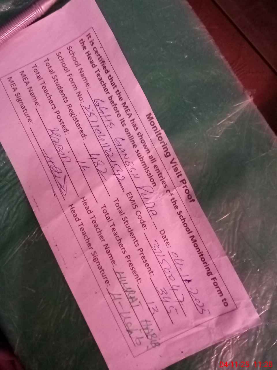| Attendance Register | Head Teacher | MEA with School | Visit Proof |