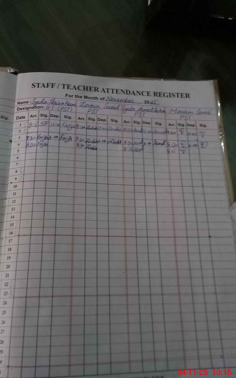 | Remarks (Use Separate Page if Required): Nonteaching staff named Zeeshan NQ was absent due to leave was not approved Students attendance in Roznamcha was 220 where as actual present after head counting was 150 White wash is required in classes and washrooms Soap was missing at hand washing point Last visit of AEO was 27 October 2025 | |||||
