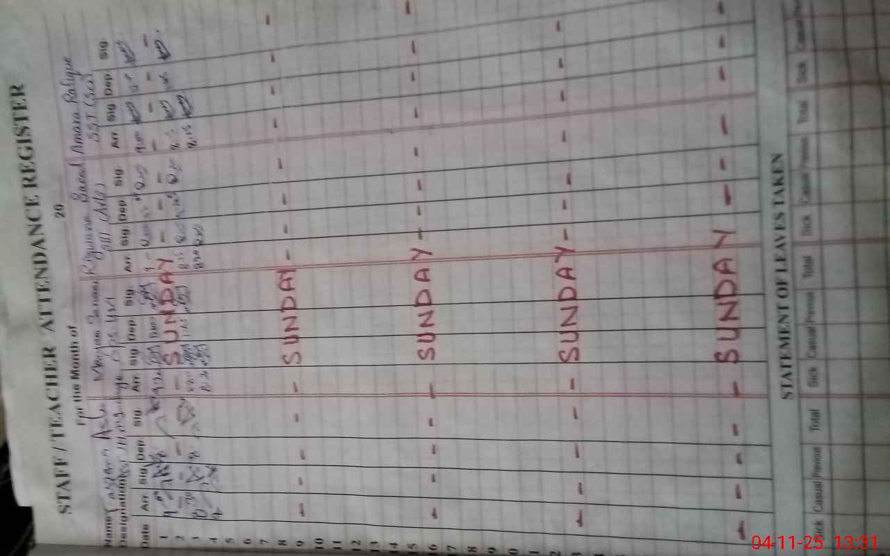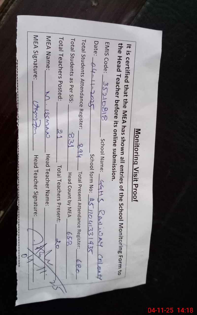 | Remarks (Use Separate Page if Required): 01 wash room is nonfunctional due to blocked NSB and FTF registers not complete for the month of October 2025 Students present strength in Roznamcha is 680 where as 658 after head counting Total students written in students attendance register are 894 Where as on SIS students strength is 831 White wash is required in school Maintenance work is required in school Furniture is required for 05 teachers and 50 students | |||||