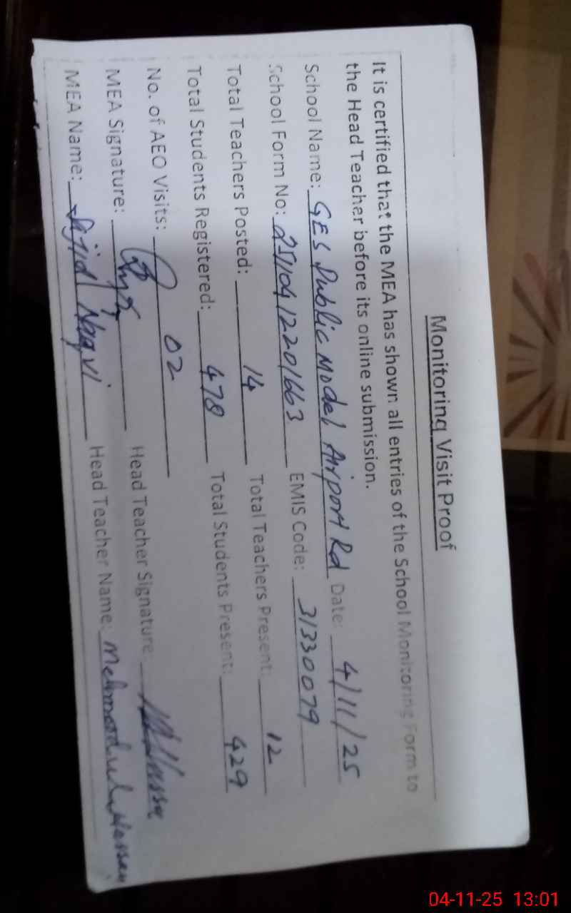 | EMIS Code: 31330079 | Name of School: GES PUBLIC MODEL AIRPORT ROAD | |||