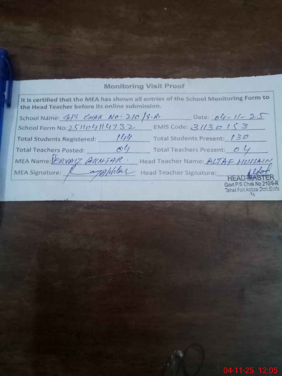 | Attendance Register | Head Teacher | MEA with School | Visit Proof |