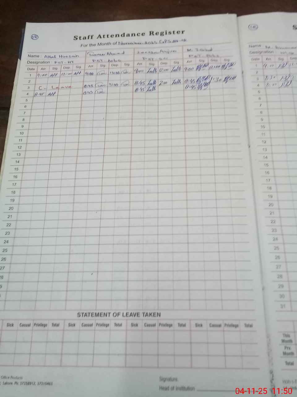 | CNIC | Full Name | Designation | R/C | Absence During Last Calender Month |