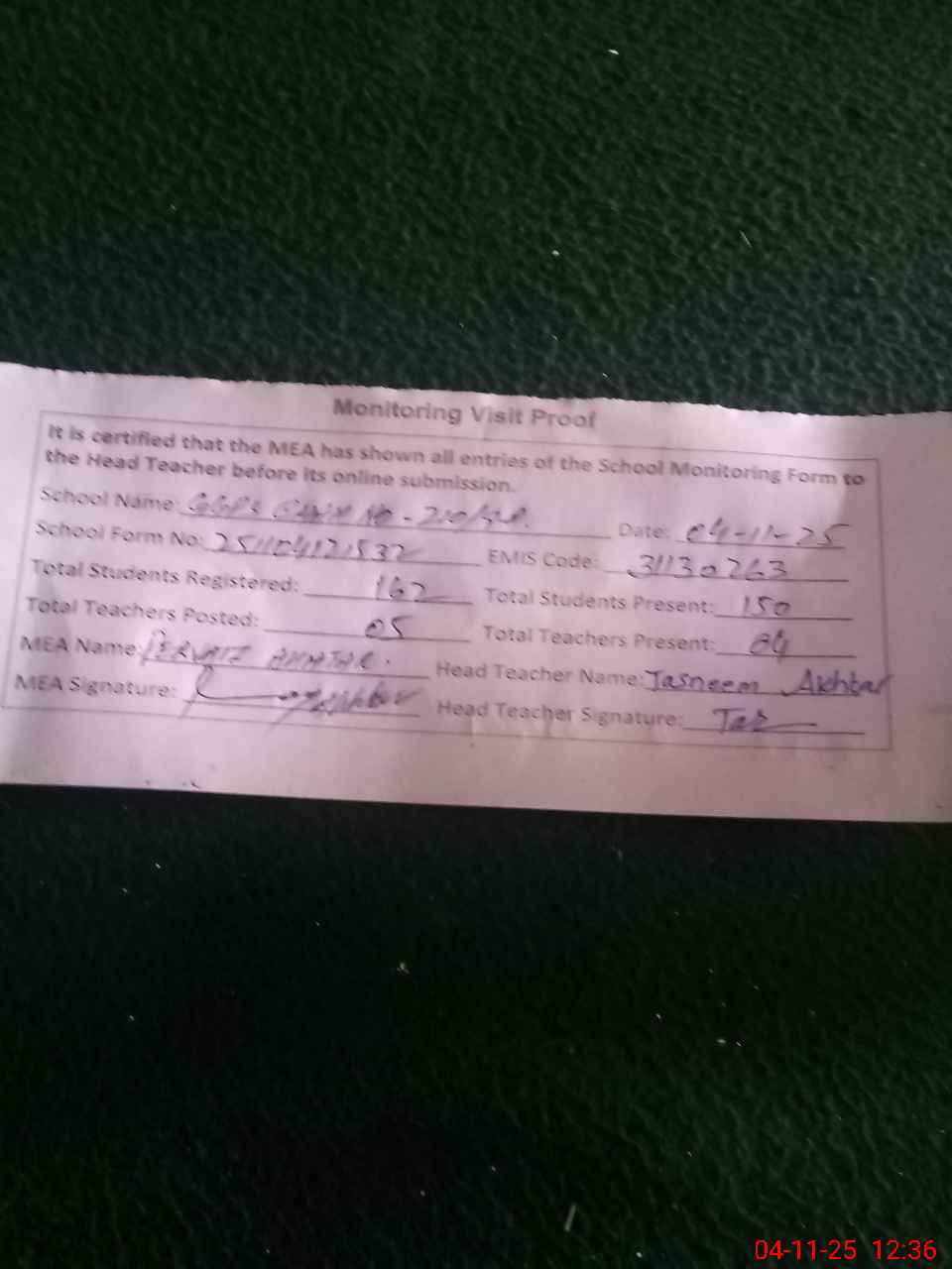 | Attendance Register | Head Teacher | MEA with School | Visit Proof |