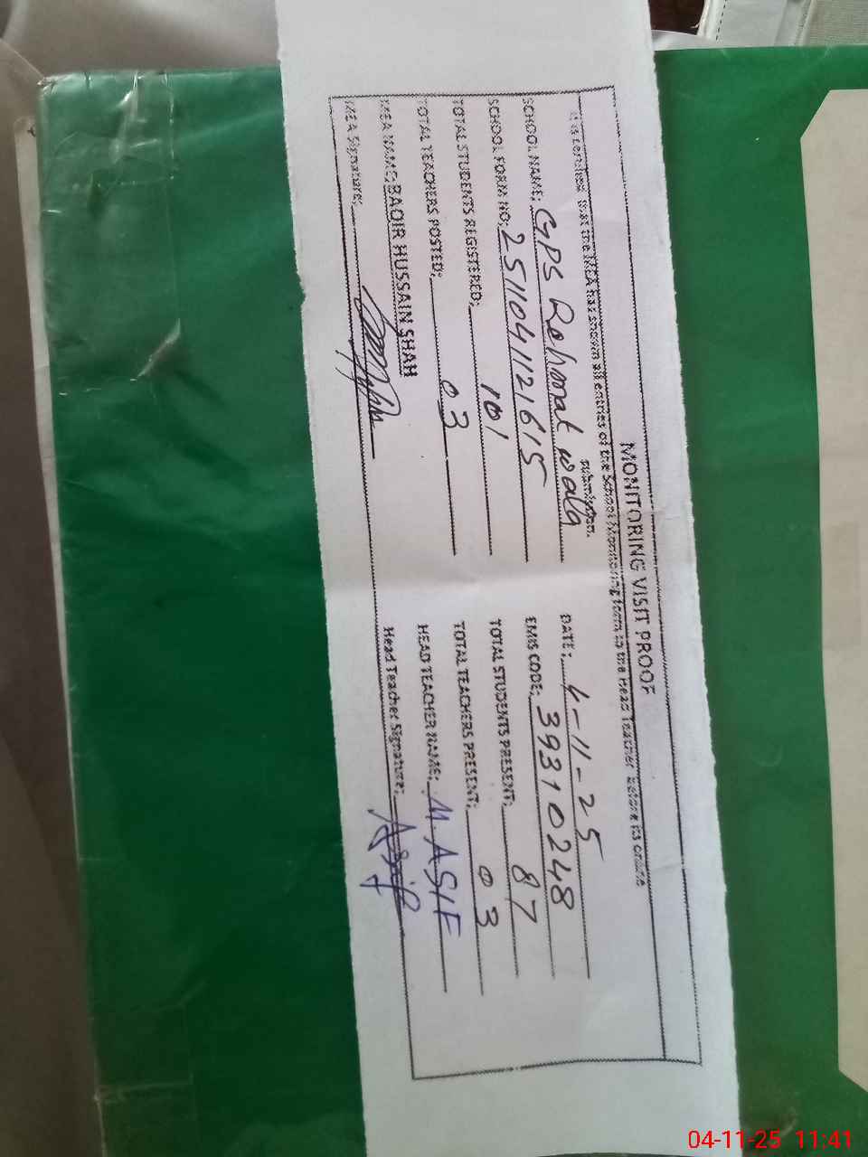 | Attendance Register | Head Teacher | MEA with School | Visit Proof |