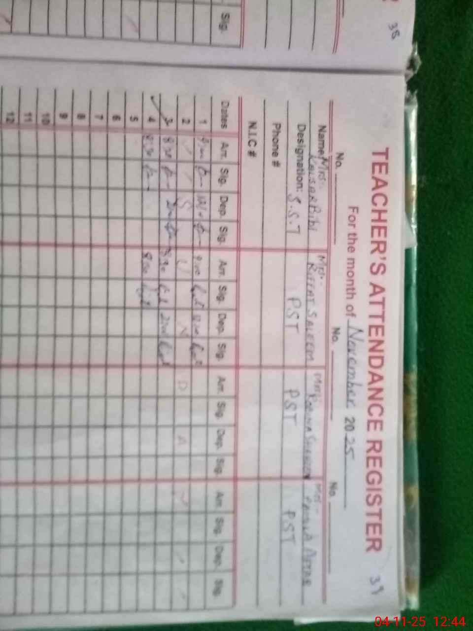 | CNIC | Full Name | Designation | R/C | Absence During Last Calender Month |