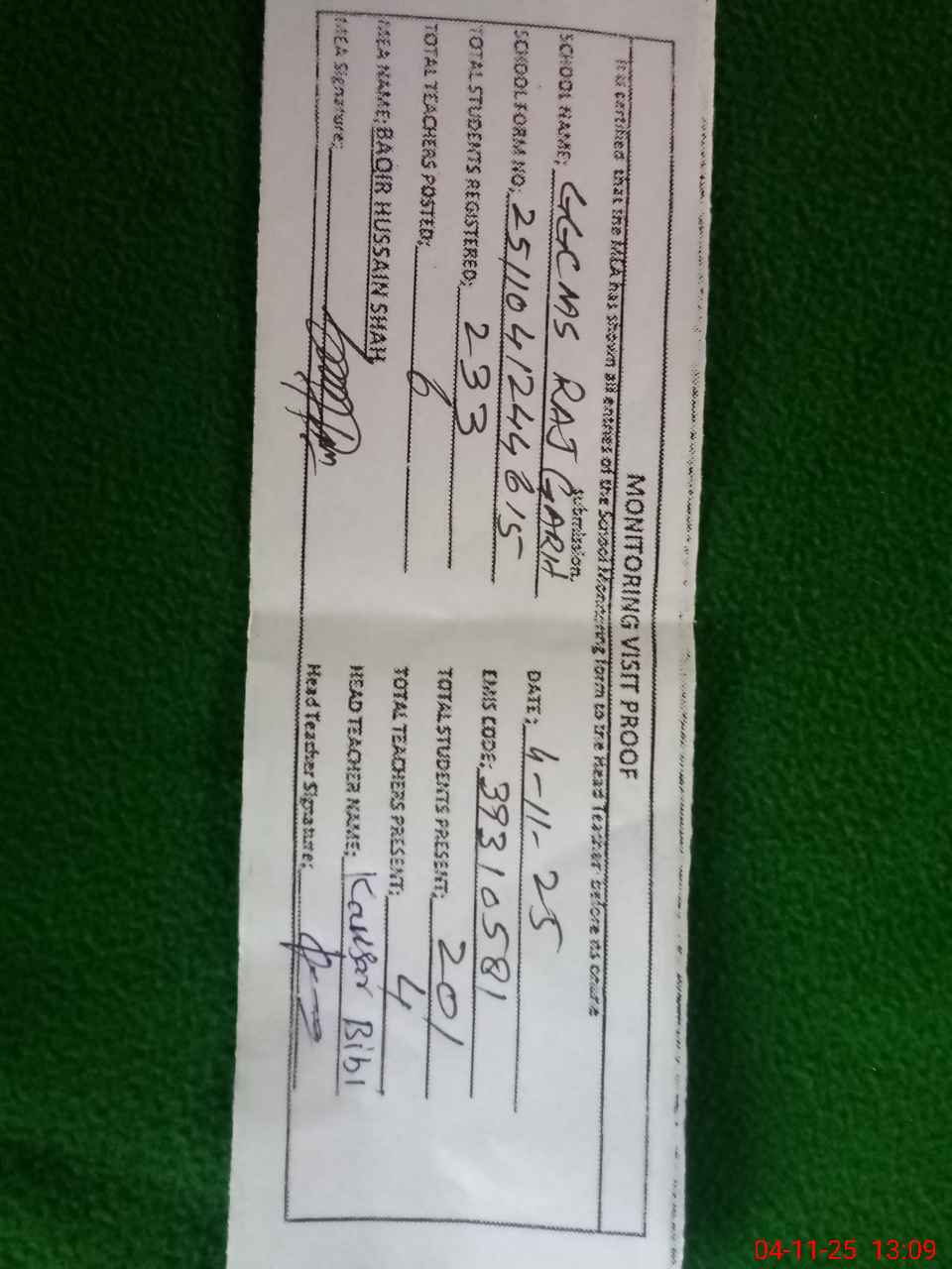 | Attendance Register | Head Teacher | MEA with School | Visit Proof |