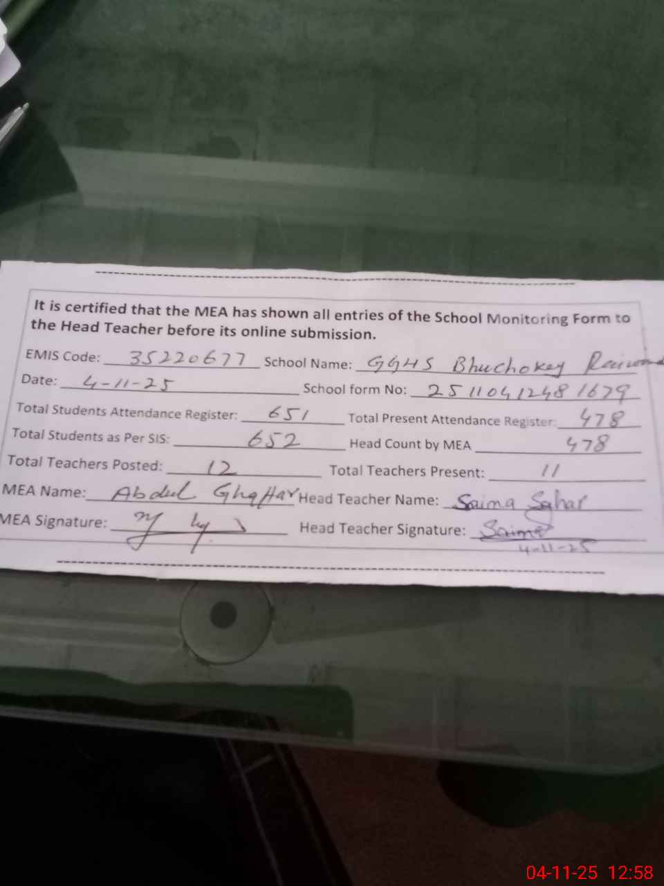 | Attendance Register | Head Teacher | MEA with School | Visit Proof |