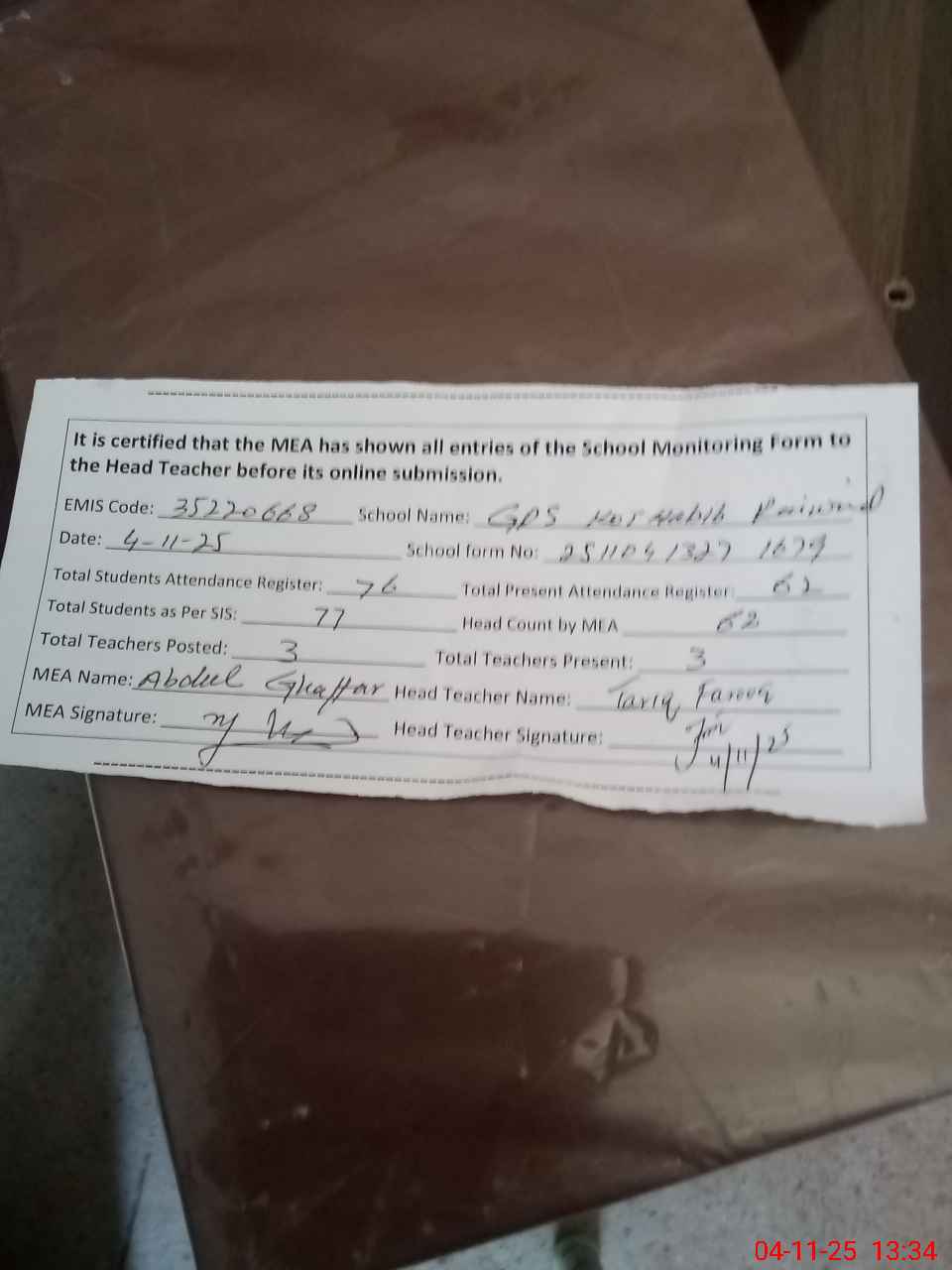 | Attendance Register | Head Teacher | MEA with School | Visit Proof |
