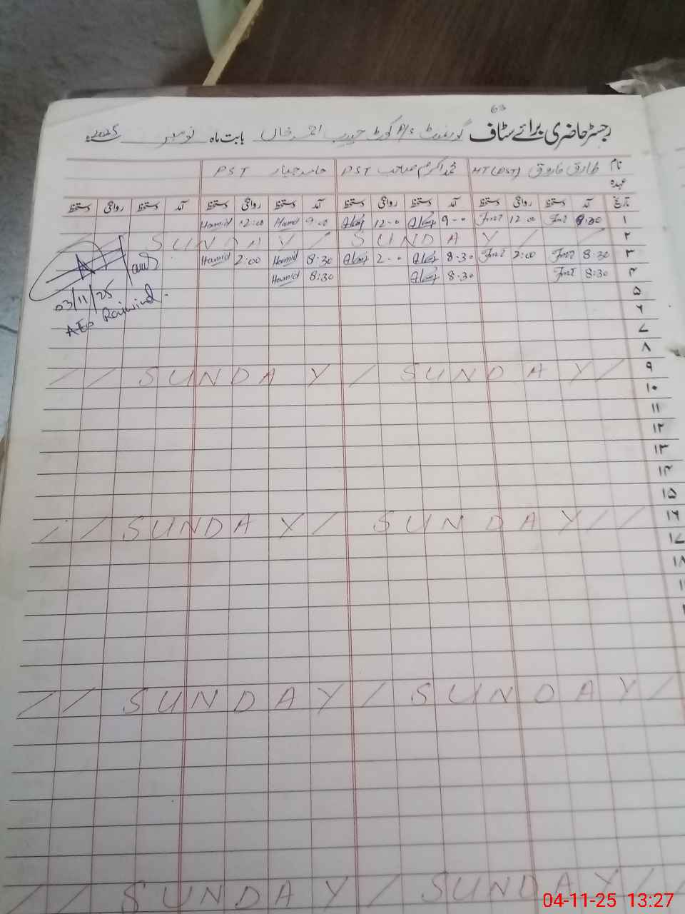 | CNIC | Full Name | Designation | R/C | Absence During Last Calender Month |