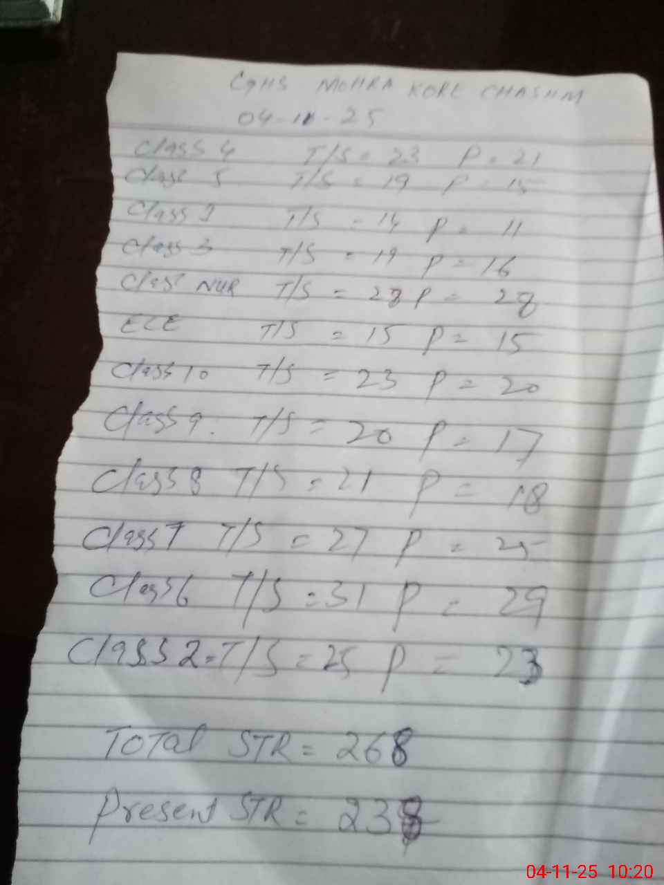 | Total Students Present | 17 | 0 | 28 | 11 | 23 | 16 | 21 | 15 | 29 | 23 | 18 | 17 | 20 | 238 | ||