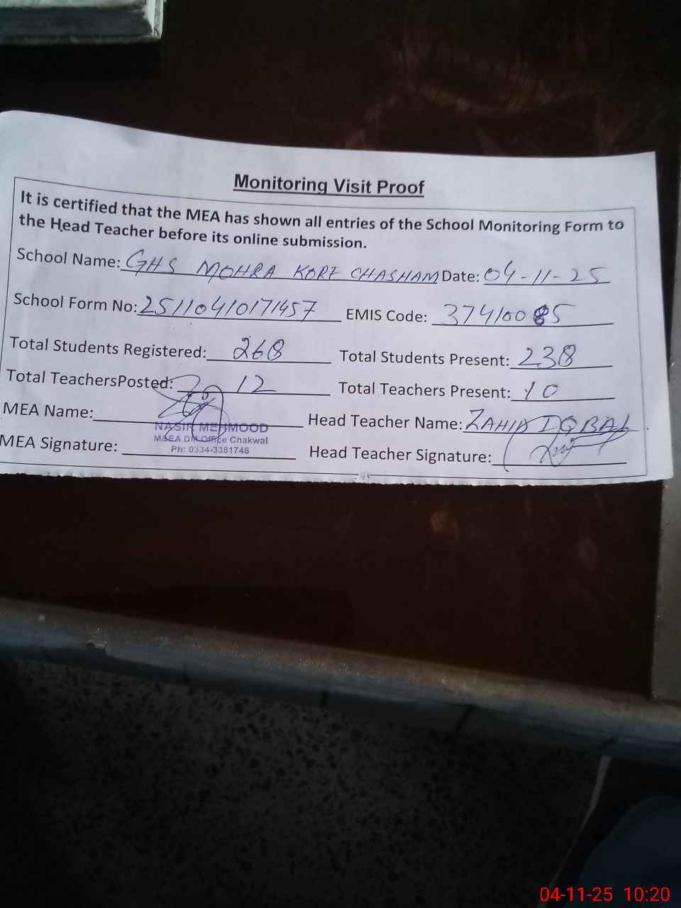 | Attendance Register | Head Teacher | MEA with School | Visit Proof |