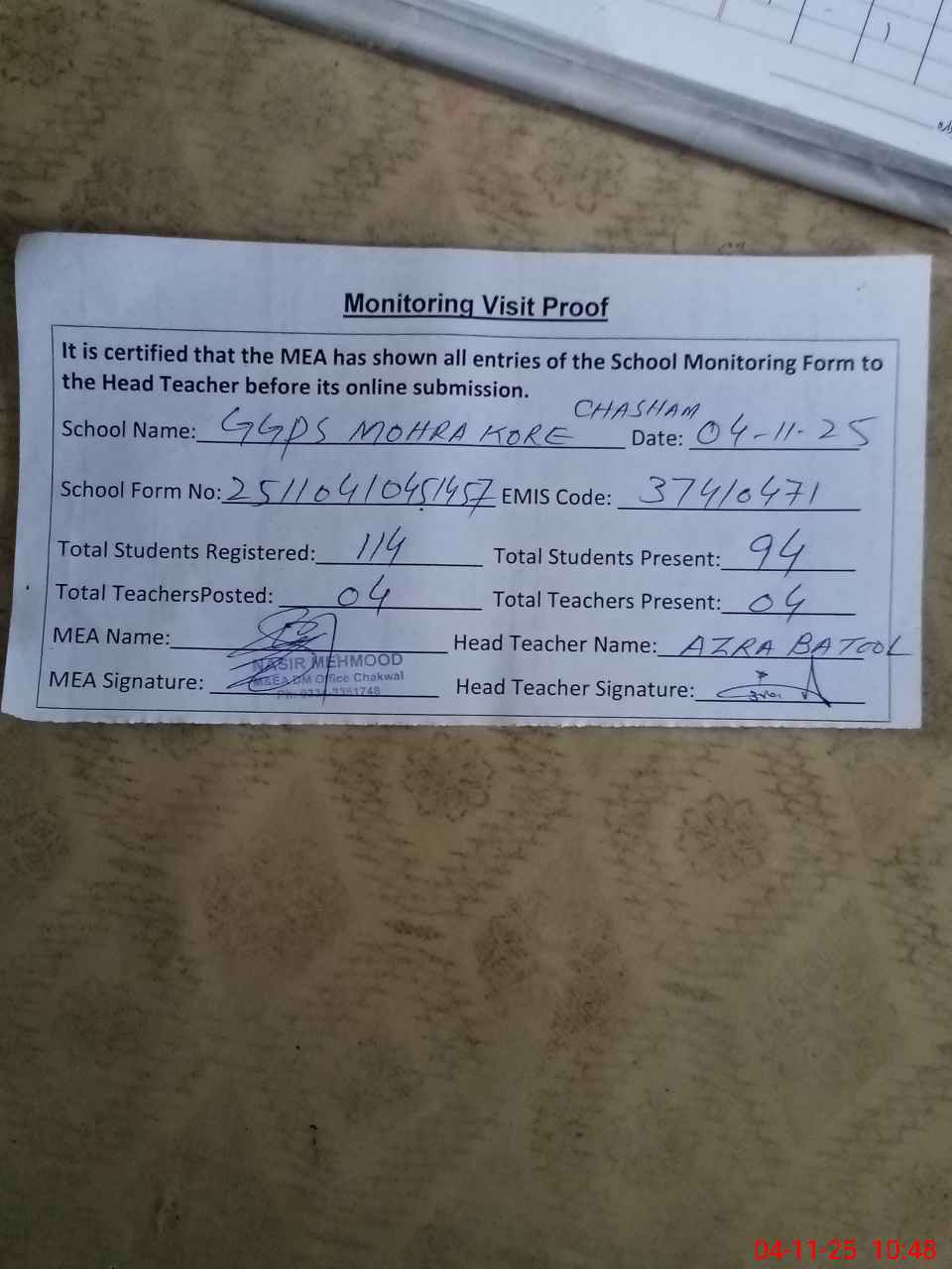 | EMIS Code: 37410471 | Name of School: GGPS MOHRA KOR CHASHAM | |||