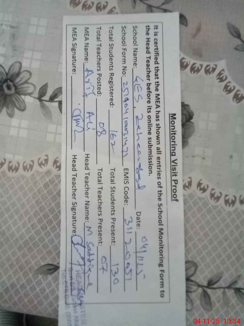 | Attendance Register | Head Teacher | MEA with School | Visit Proof |