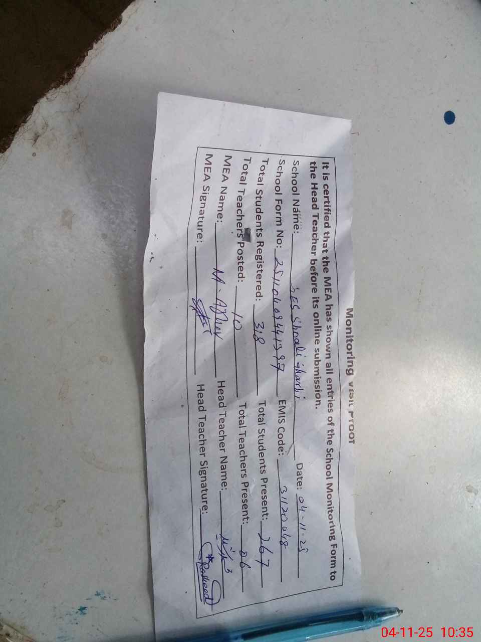 | Attendance Register | Head Teacher | MEA with School | Visit Proof |