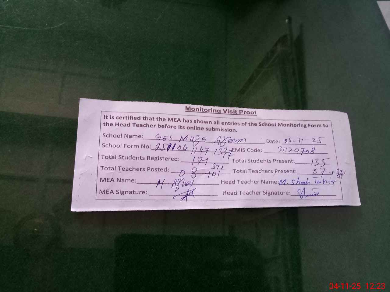 | Attendance Register | Head Teacher | MEA with School | Visit Proof |