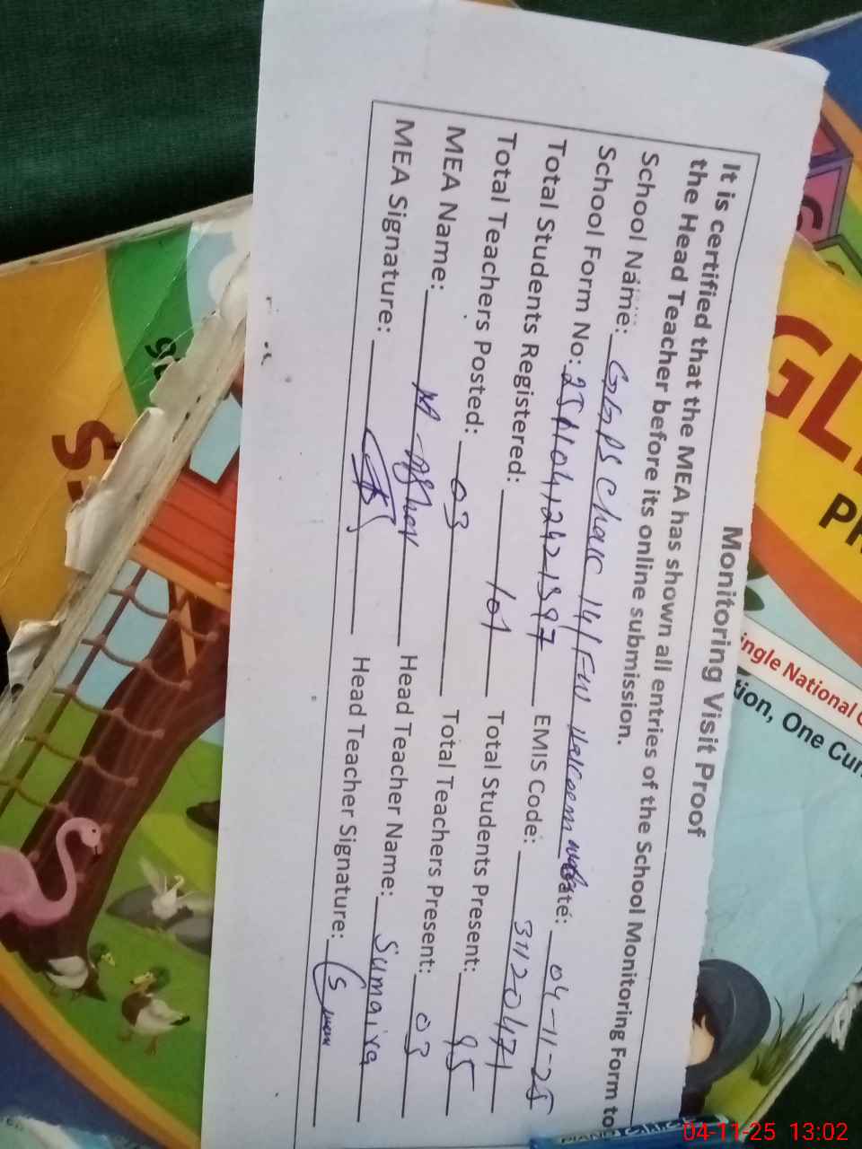 | Attendance Register | Head Teacher | MEA with School | Visit Proof |