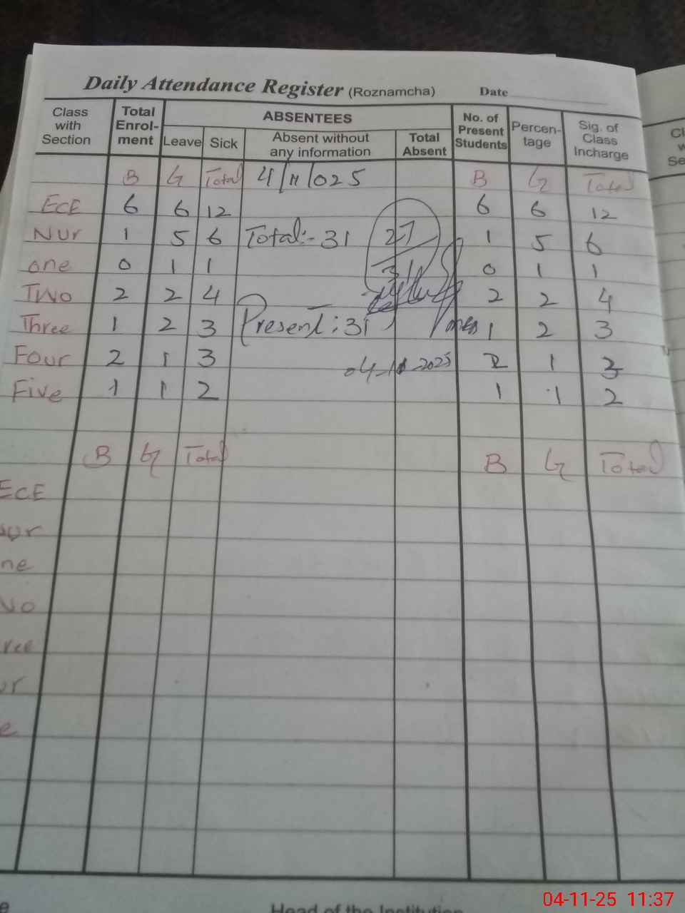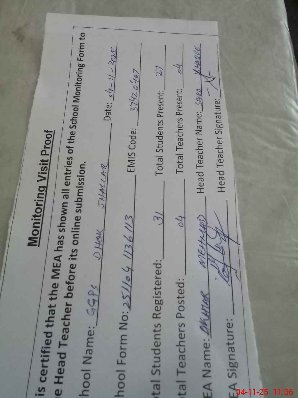 | Attendance Register | Head Teacher | MEA with School | Visit Proof |