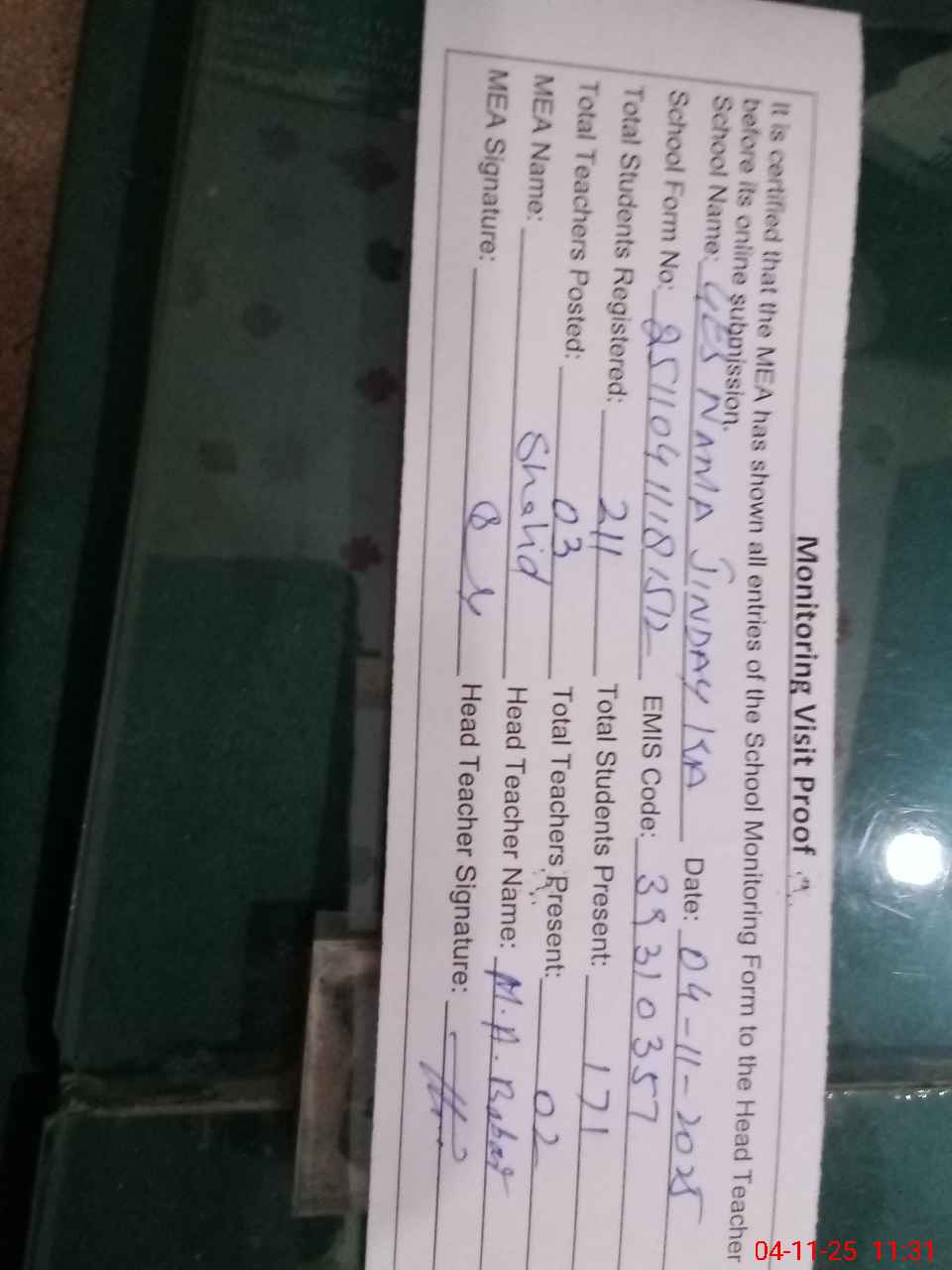 | Attendance Register | Head Teacher | MEA with School | Visit Proof |