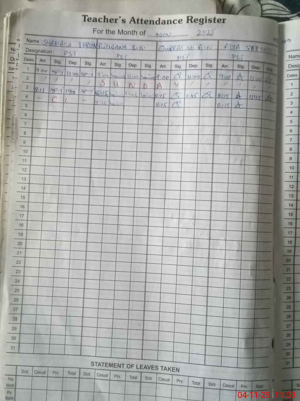 | CNIC | Full Name | Designation | R/C | Absence During Last Calender Month |