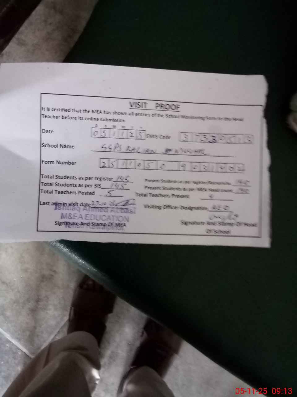 | Attendance Register | Head Teacher | MEA with School | Visit Proof |