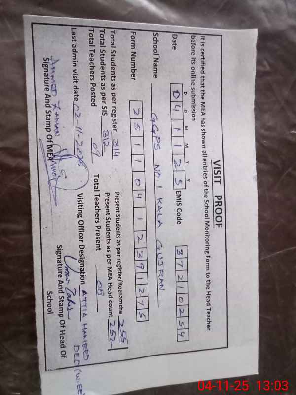 | EMIS Code: 37210254 | Name of School: GGPS NO. 1 KALA GUJRAN | |||