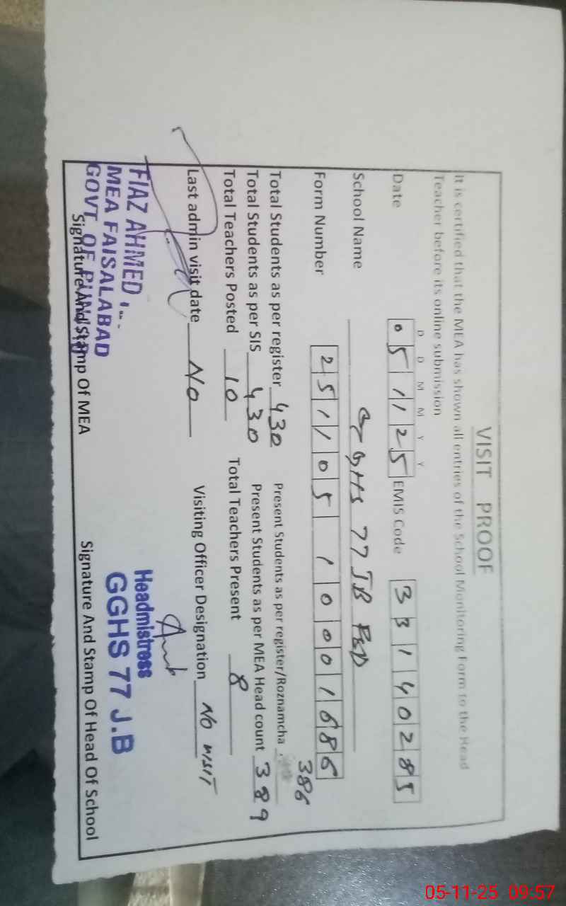 | EMIS Code: 33140285 | Name of School: GGHS CHAK NO. 77 JB MULLANPUR | |||