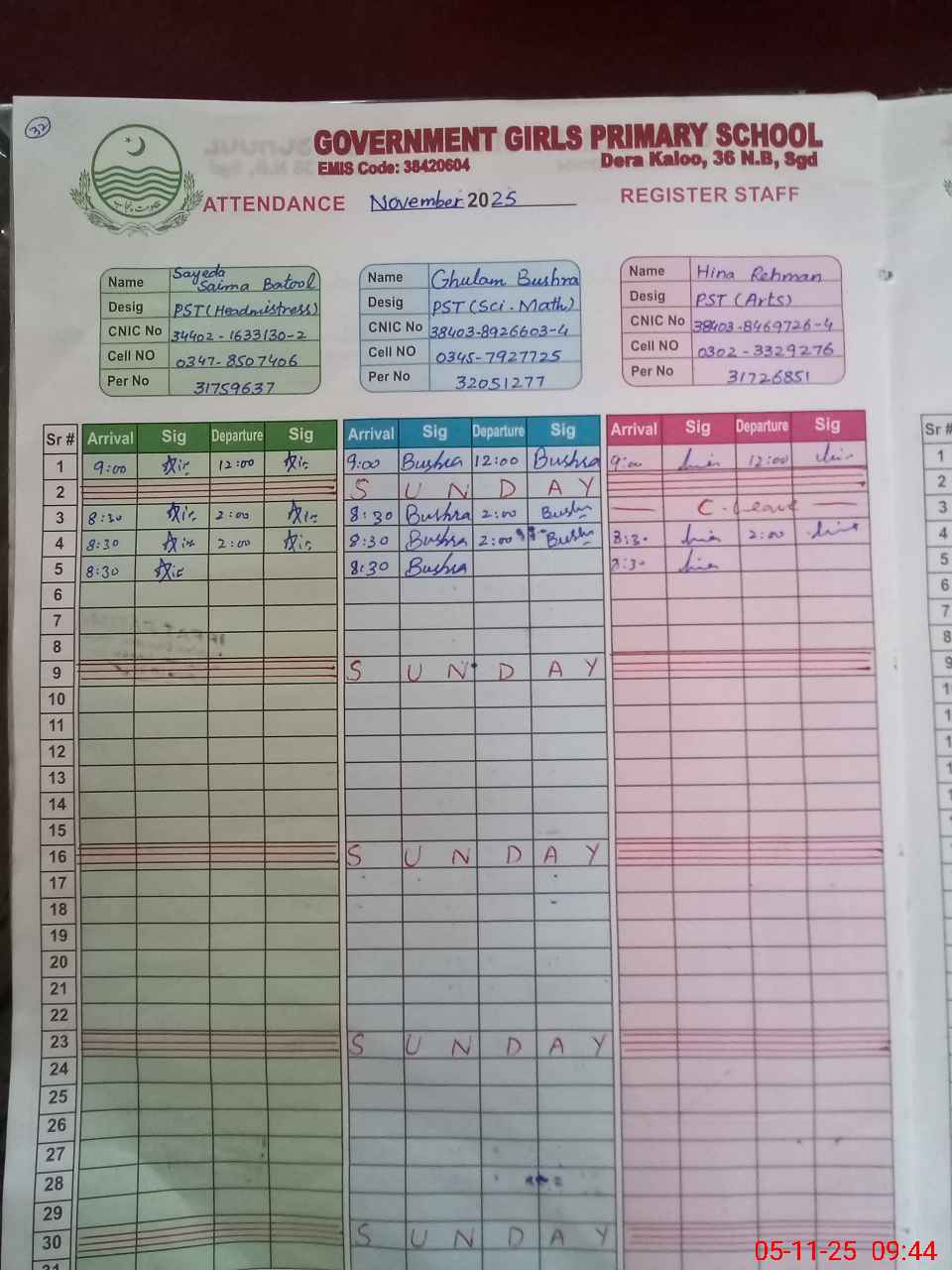 | CNIC | Full Name | Designation | R/C | Absence During Last Calender Month |