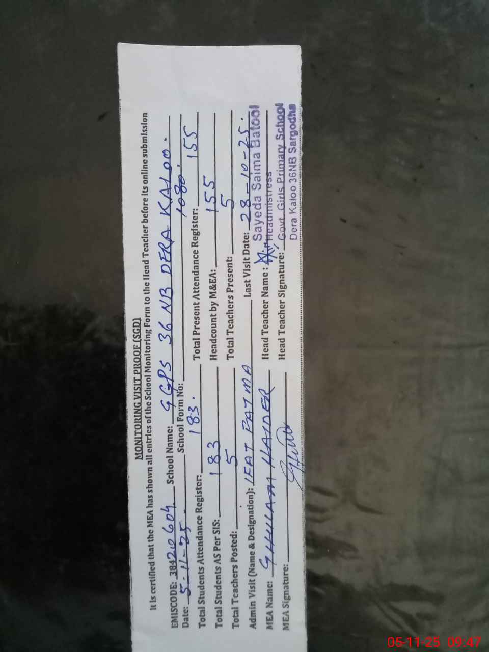 | Attendance Register | Head Teacher | MEA with School | Visit Proof |