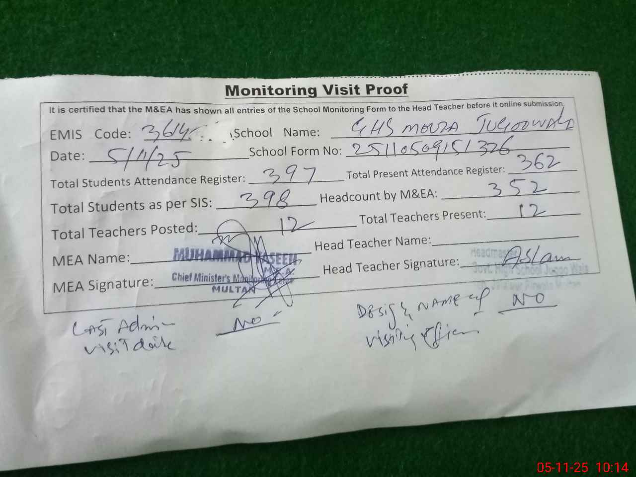 | Attendance Register | Head Teacher | MEA with School | Visit Proof |