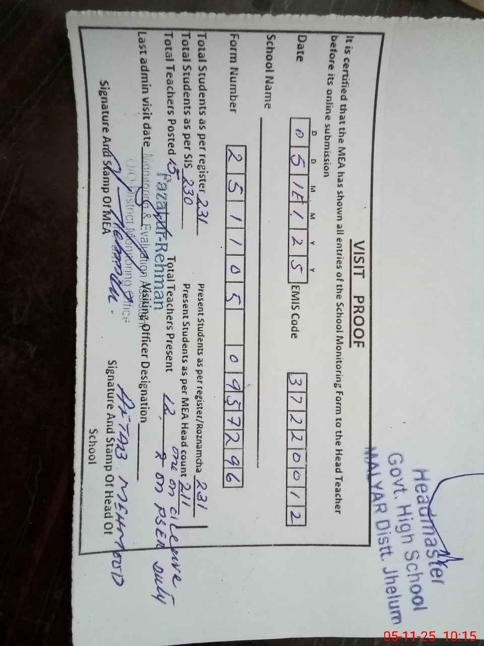 | Attendance Register | Head Teacher | MEA with School | Visit Proof |