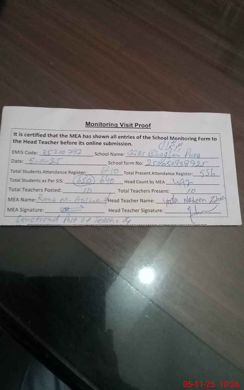 | Remarks (Use Separate Page if Required): Sweeper Riffat Shahid manual posted in afforsaid school from GGHS Shadbagh wef 22 may 2025 and her name not entered on SIS because her posting QR Code not generated still Total students Enrolled as per register and 640 Total present students according to register 556 Total present students according to Head count 492 Difference 64 students Students attendance today 77 percent present | |||||