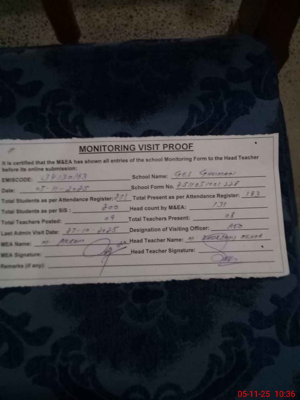 | Attendance Register | Head Teacher | MEA with School | Visit Proof |