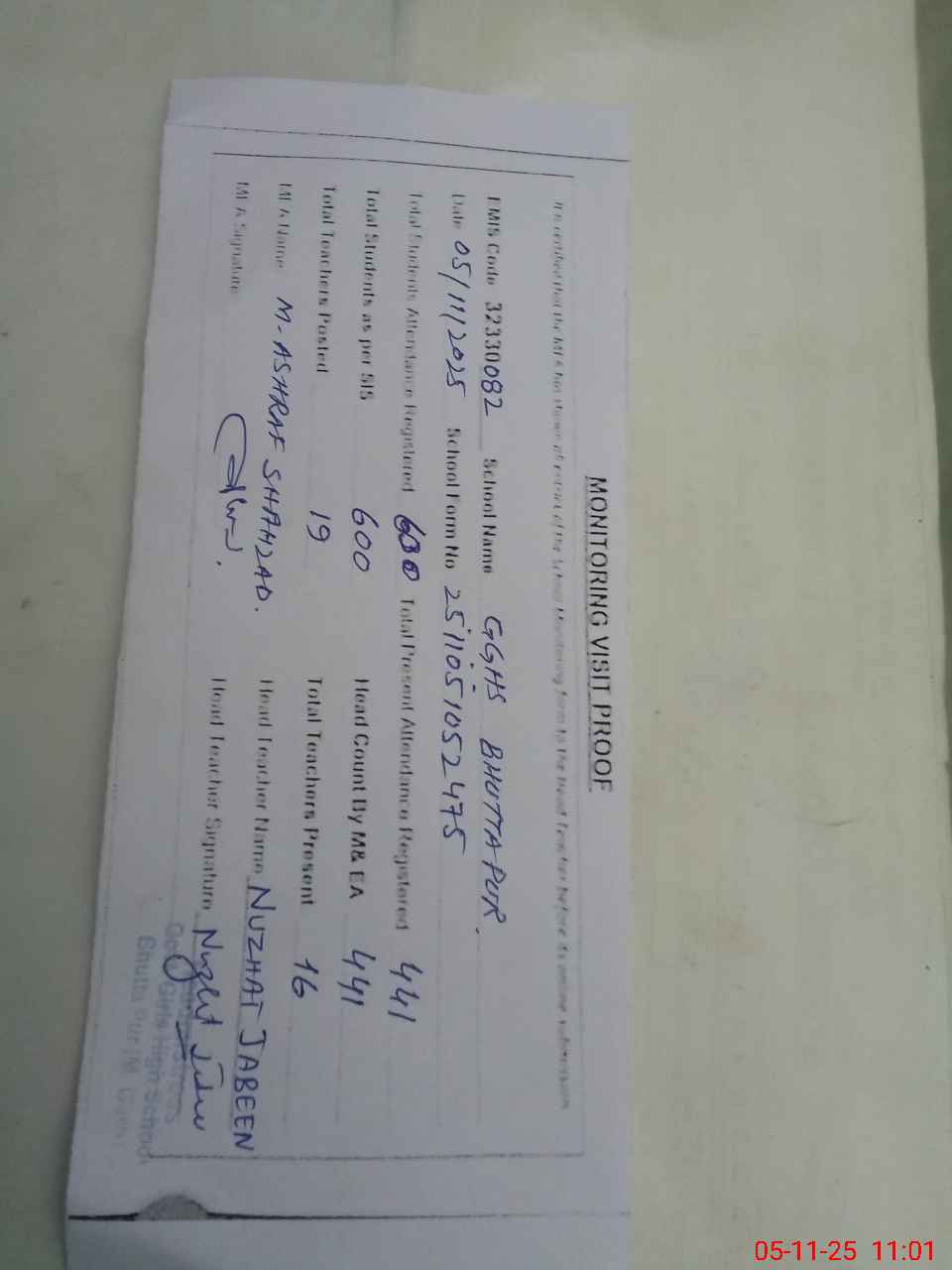 | Attendance Register | Head Teacher | MEA with School | Visit Proof |