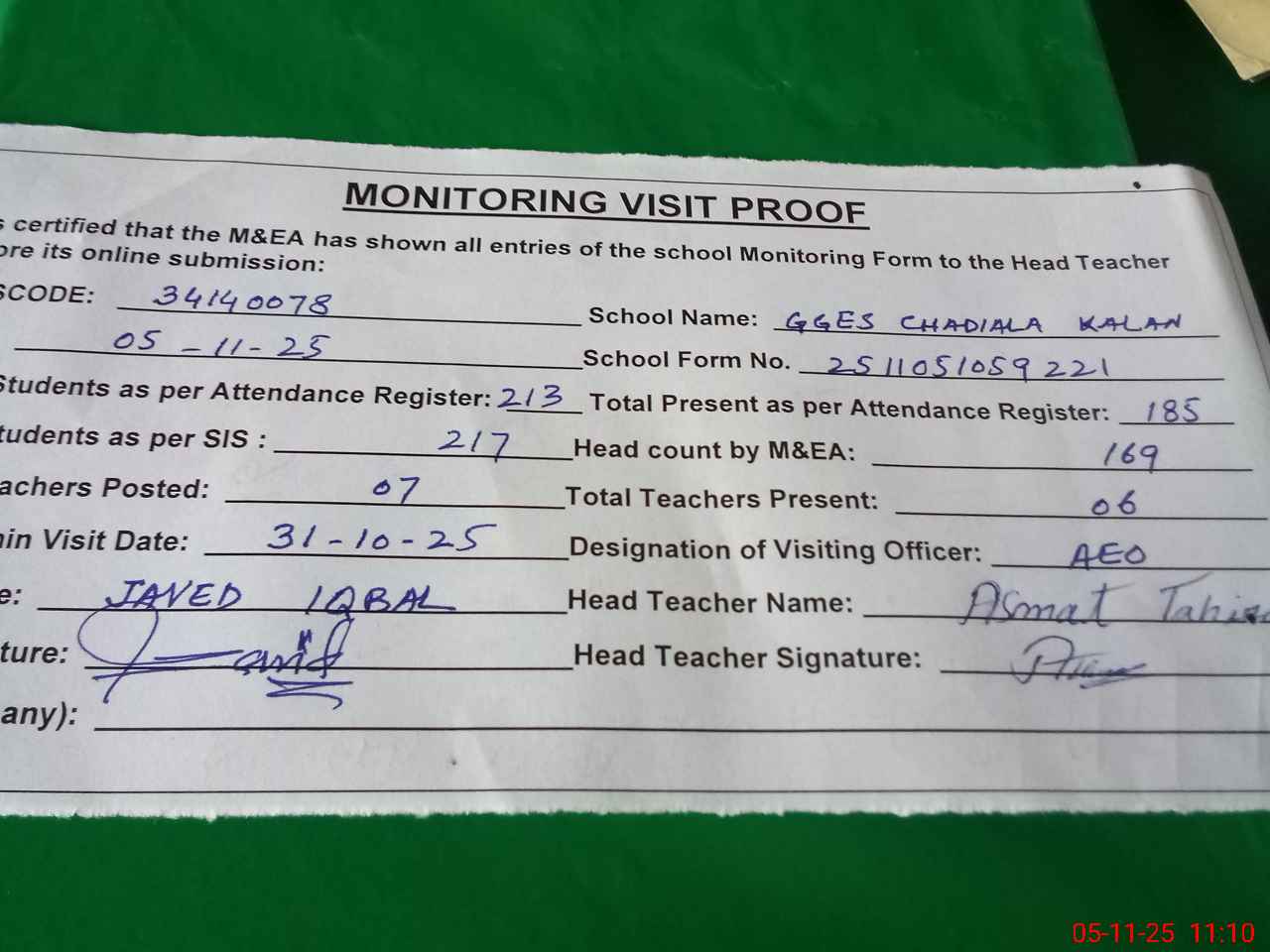 | Attendance Register | Head Teacher | MEA with School | Visit Proof |