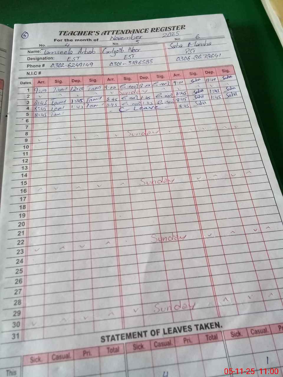 | CNIC | Full Name | Designation | R/C | Absence During Last Calender Month |