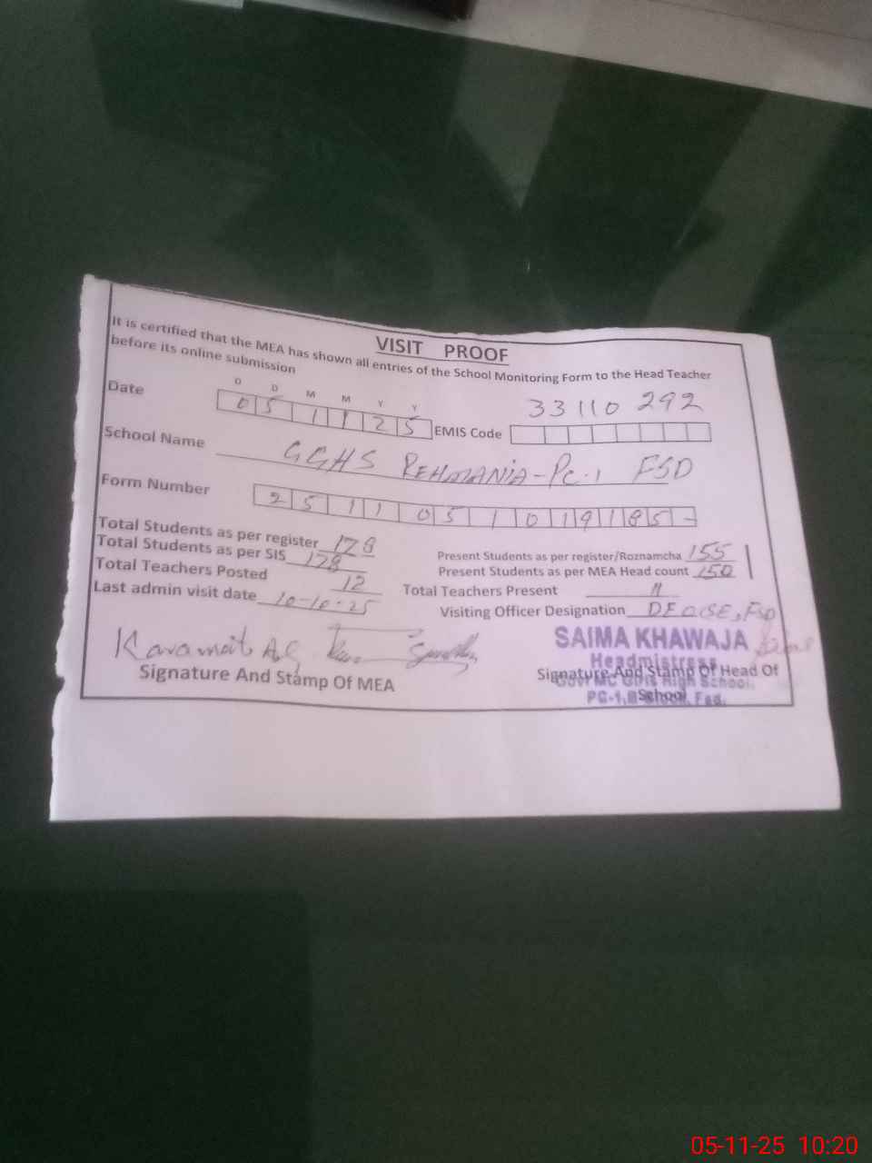 | EMIS Code: 33110292 | Name of School: GGHS MC PEOPLES COLONY NO.1 FSD B.BLOCK | |||