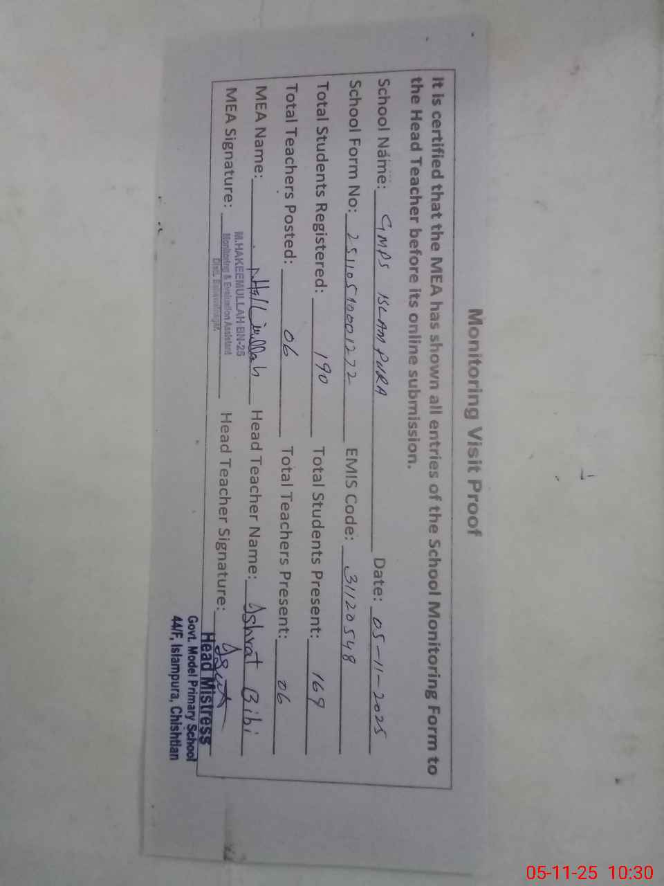 | EMIS Code: 31120548 | Name of School: GMPS 44/F ISLAM PURA | |||