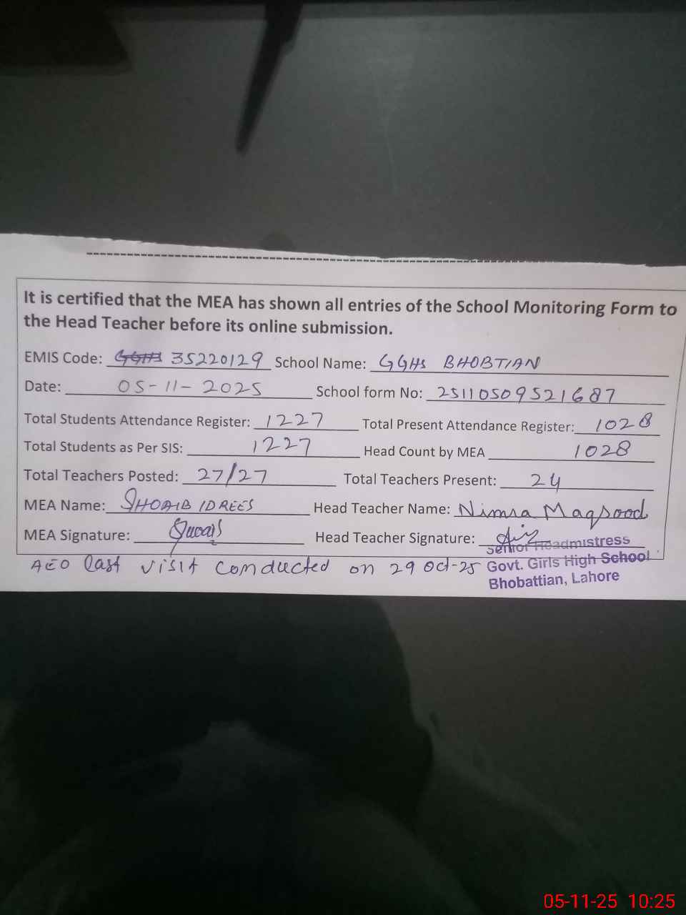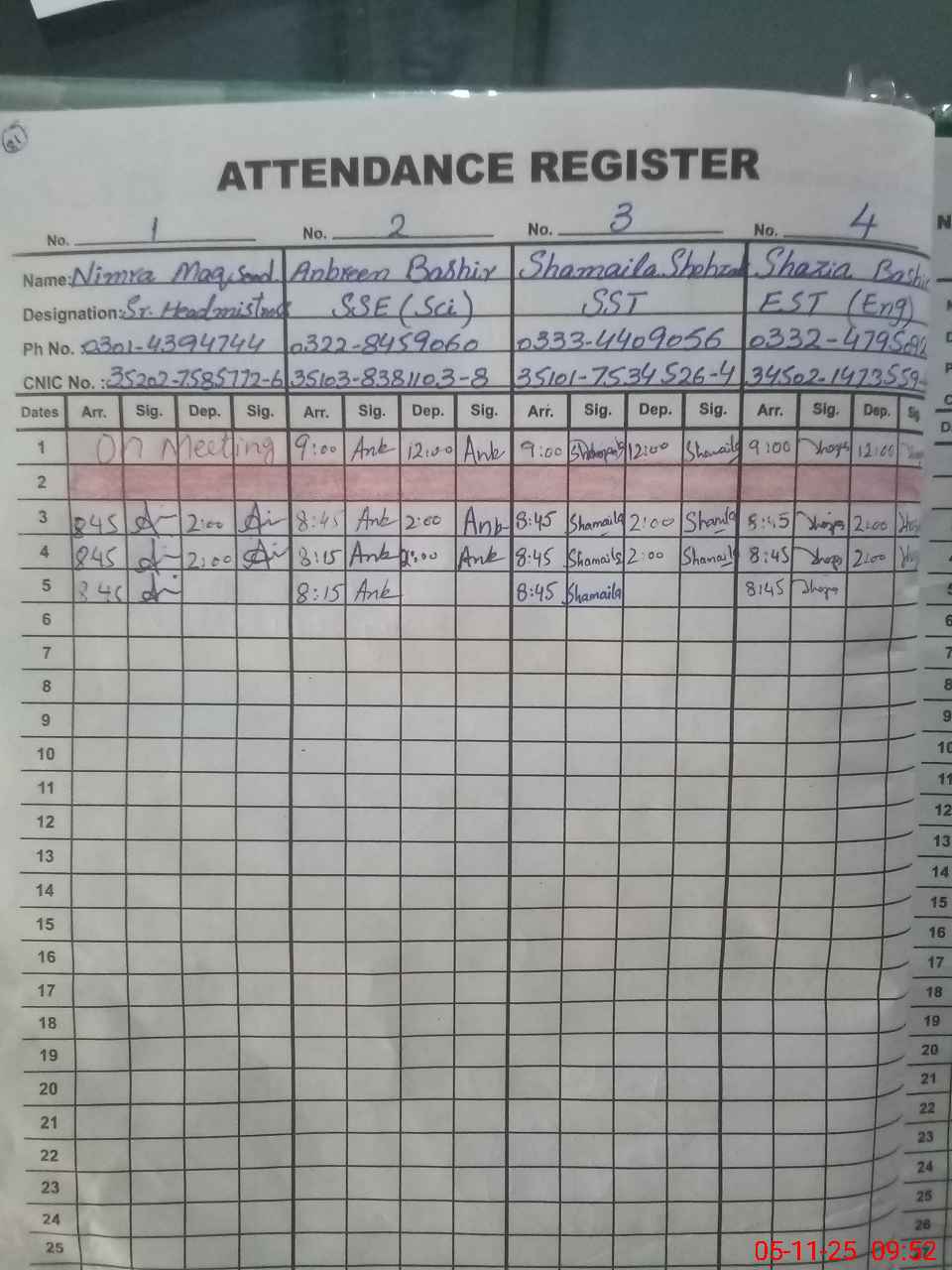 | Remarks (Use Separate Page if Required): 1 This school comprises of two separate campus primary and secondary ECE Nursery 4th and 5th classes are studying in primary campus 2 AEO Shamsha conducted the previous visit on 29 October 2025 3 Sajida Asghar SST has been absent since May 2024 | |||||