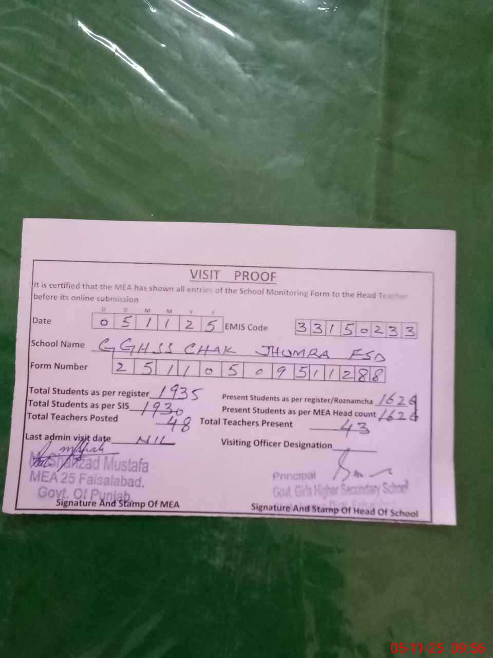| Attendance Register | Head Teacher | MEA with School | Visit Proof |