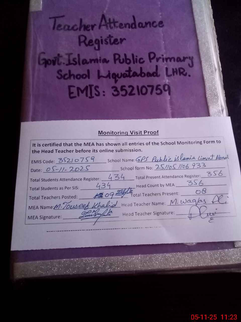 | Attendance Register | Head Teacher | MEA with School | Visit Proof |