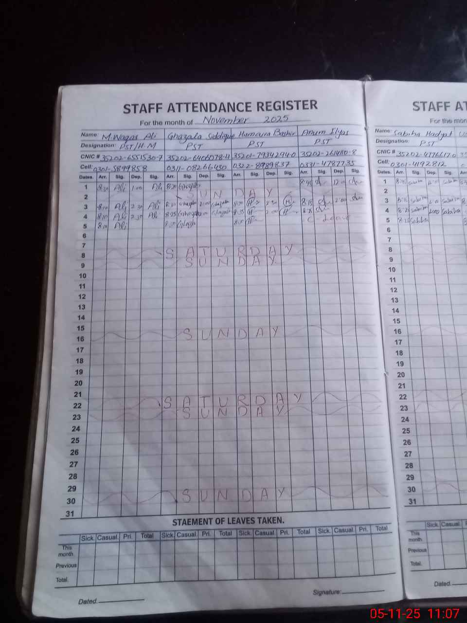 | CNIC | Full Name | Designation | R/C | Absence During Last Calender Month |