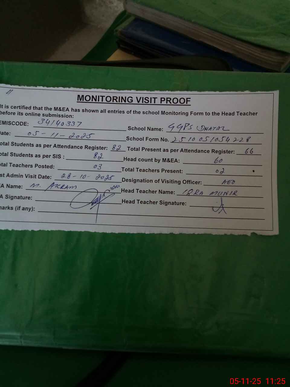 | Attendance Register | Head Teacher | MEA with School | Visit Proof |