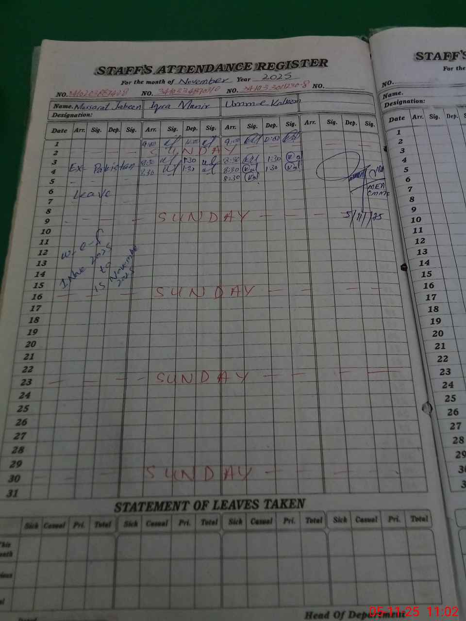 | Leave | Duty | Absent | Maternity | Medical | Ex- Pak |